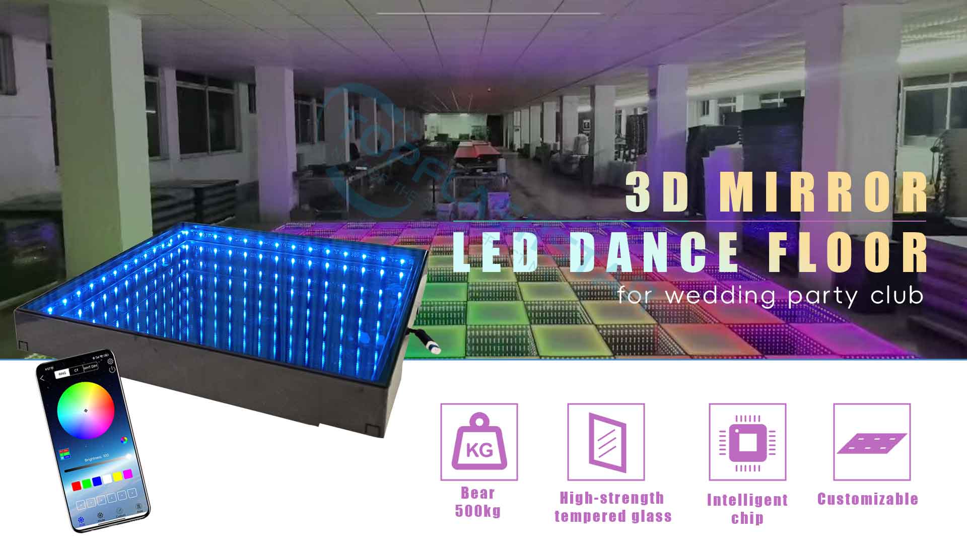A 3D LED dance floor tile is a visual lighting panel that creates an infinity mirror effect with RGB lighting. The tile produces deep visual layers and dynamic movement effects, making it ideal for high-impact environments such as nightclubs, weddings, and live performances.